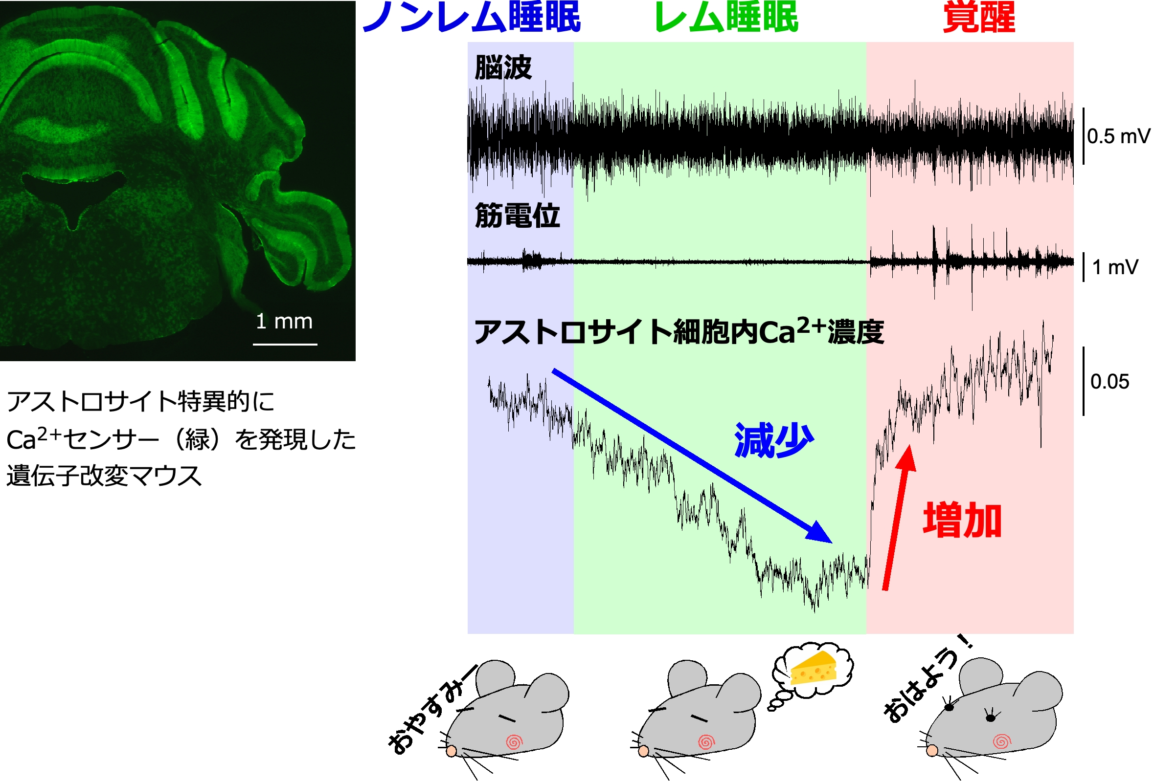 アストロサイトの活動はレム睡眠時に減少する