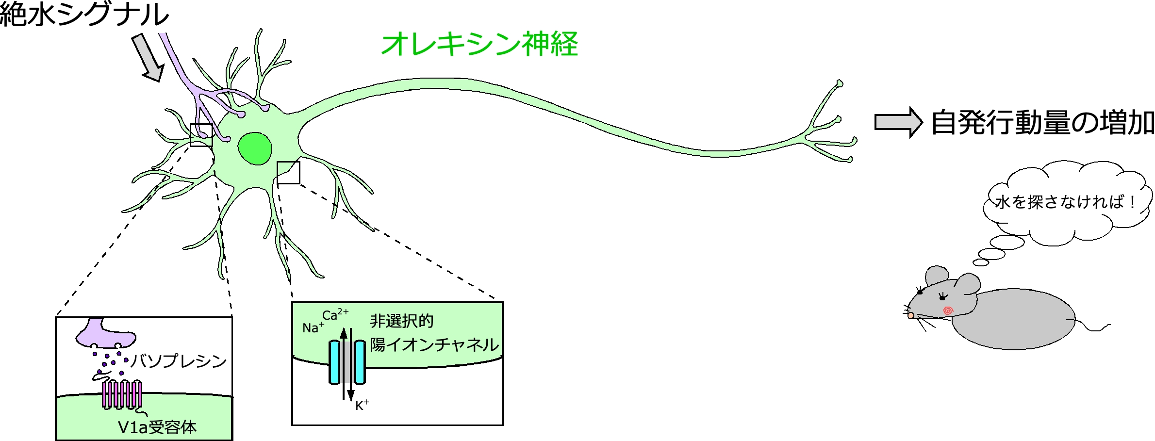 神経ペプチドの一種であるオレキシンを産生するオレキシン神経は、視床下部外側野に局在しており、覚醒の維持に重要な役割を担う。本研究では、オレキシン神経の活動を制御する神経メカニズムを解明した。スライスパッチクランプ法を用いて、バソプレシンがV1a受容体を介して、その下流の非選択的陽イオンチャネルを開口させることでオレキシン神経を活性化することを明らかにした。また、マウス個体を用いた行動薬理学実験より、絶水時の自発行動量の増加にこのV1a受容体を介したオレキシン神経の活性化が重要な役割を果たしていることを見出した。オレキシン神経への入力系を明らかにすることにより、睡眠覚醒制御機構をはじめとする本能行動の根幹をなす神経機構の解明に貢献した。