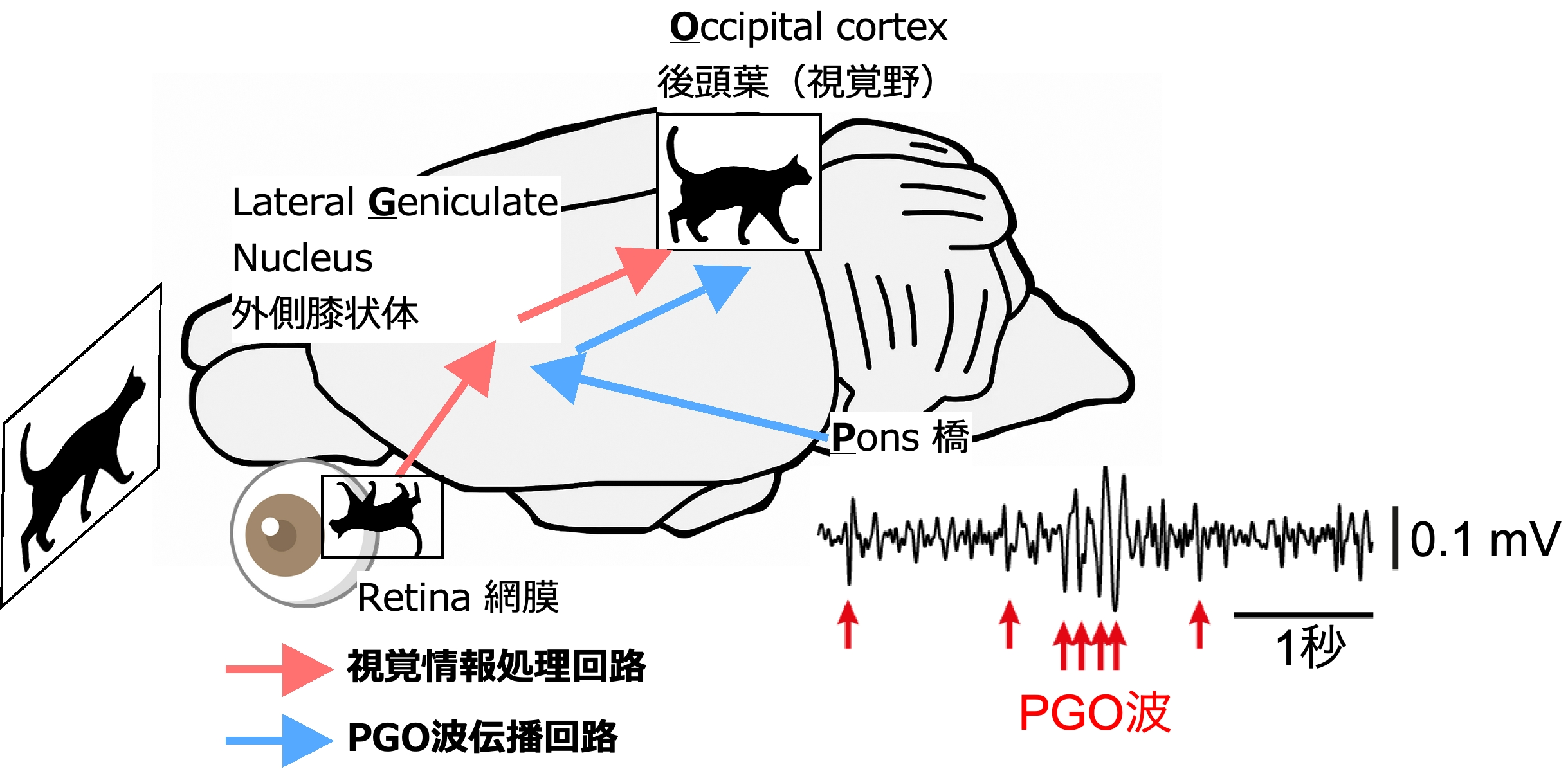 光遺伝学や化学遺伝学により、レム睡眠の制御に脳幹が重要な役割を担っていることが明らかにされてきた。Ponto-geniculo-occipital(PGO)波とよばれる睡眠脳波は脳幹で発生し、脳内全体に伝播していくことが知られていたが、半世紀以上マウスには存在しないと考えられていた。本論文では、マウスでのPGO波の測定に世界で初めて成功した。PGO波はその伝播回路が視覚情報処理回路と良く似ていることから、1970年代から「夢」を脳内で作り出していると予想されてきた。未だに誰も実験的には明らかに出来ていないが、今回マウスのPGO波を発見したことにより、今後夢を見るメカニズム解明にも繋がる可能性を秘めている。