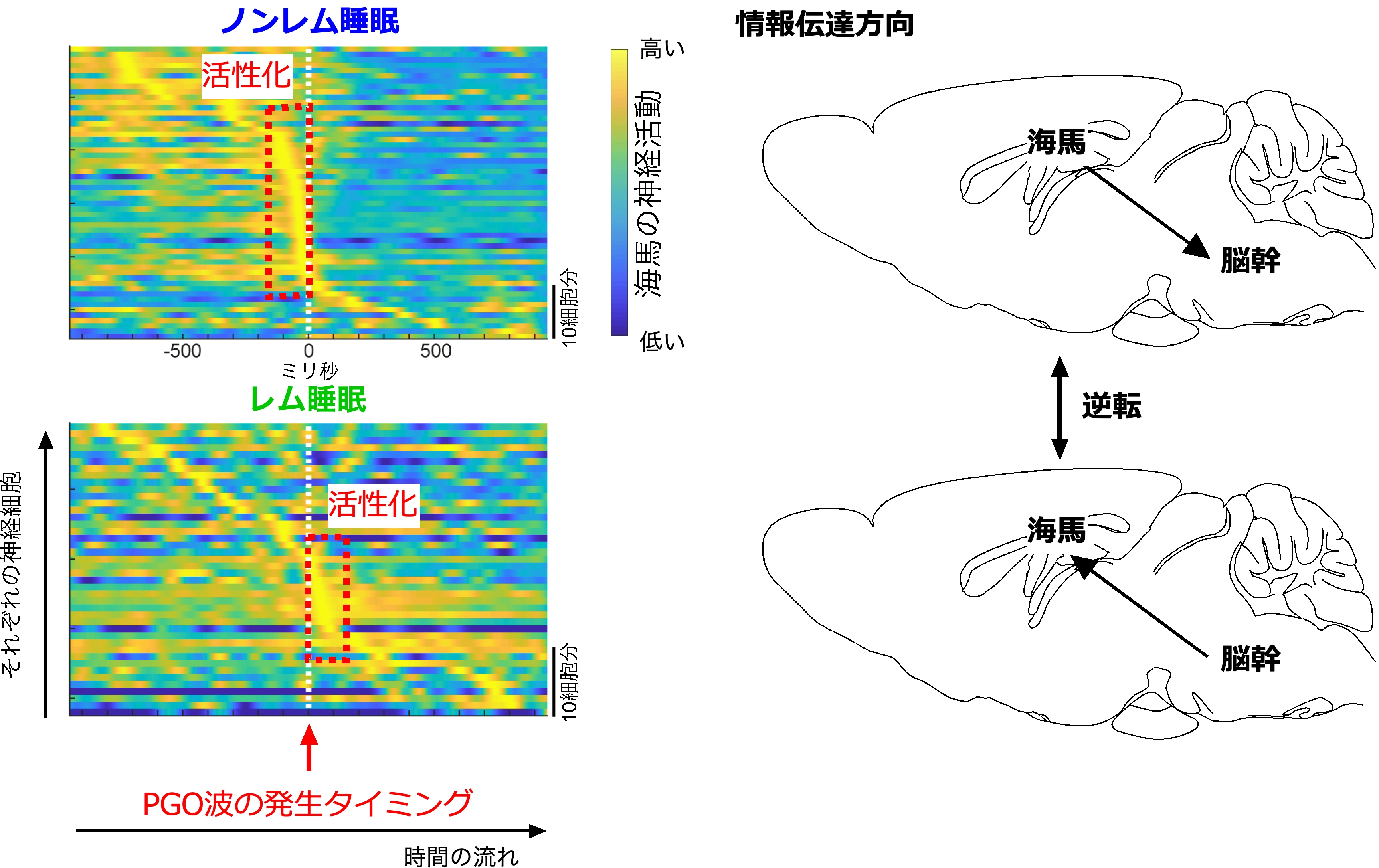 さらに、シリコンプローブを用いた大規模細胞外記録法を用いて、睡眠覚醒を繰り返すマウスからPGO波と海馬神経活動やリップル波を同時に測定した。その結果、ノンレム睡眠時は海馬神経活動やリップル波が起こった後にPGO波が観察されるが、レム睡眠時はPGO波が起こった後に海馬神経活動が高まることを見出した。本論文により、異なる睡眠状態では、脳幹と海馬の脳領域間での情報伝達方向が逆転することを世界で初めて示した。この発見により、同じ睡眠状態でも、レム睡眠とノンレム睡眠で生理機能が異なる可能性が示された。